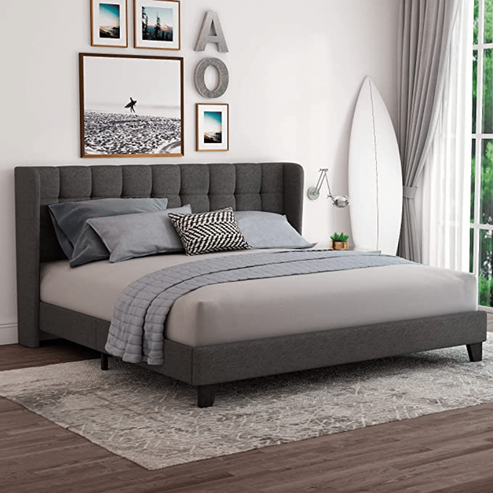 Take your bedroom to the next level with the Einfach King Size Upholstered Wingback Platform Bed Frame. This bed frame features a wingback headboard upholstered in a linen-inspired fabric for a chic look.