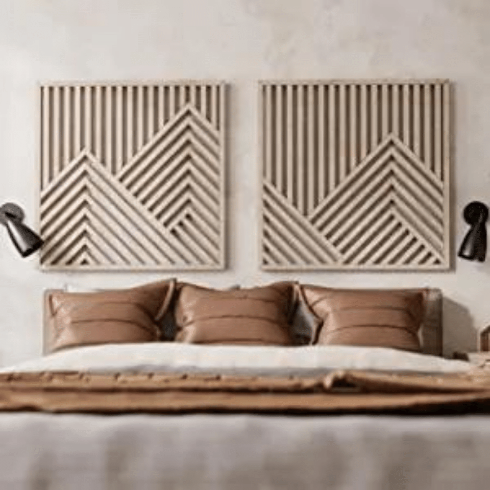 This set features two wood wall art panels with a complex geometric mountain design – perfect for adding a touch of rustic charm to any room.