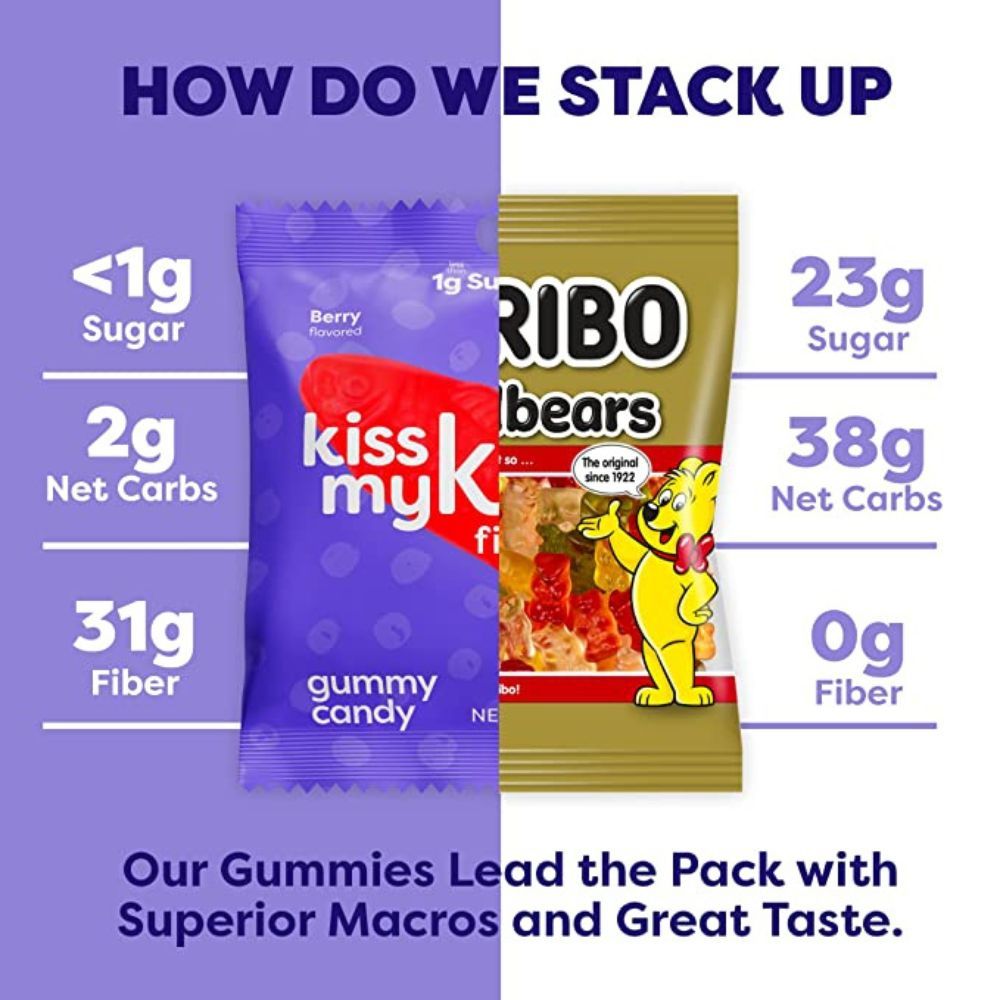 If you're looking for almost no carb snacks, then Kiss My Keto Gummies Candy is the perfect sweet treat for you. Each bag contains just 2g net-carbs, high in fiber and only 40 calories per bag.