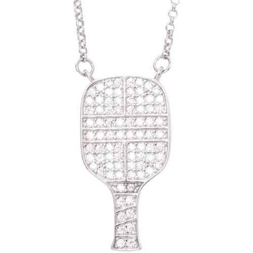 Beautifully crafted from .925 Sterling Silver and Platinum plated, the Pickleball necklace is sure to dazzle with its 15 mm by 30 mm sparkling cubic zircons settled on a 27 cm sterling silver chain.