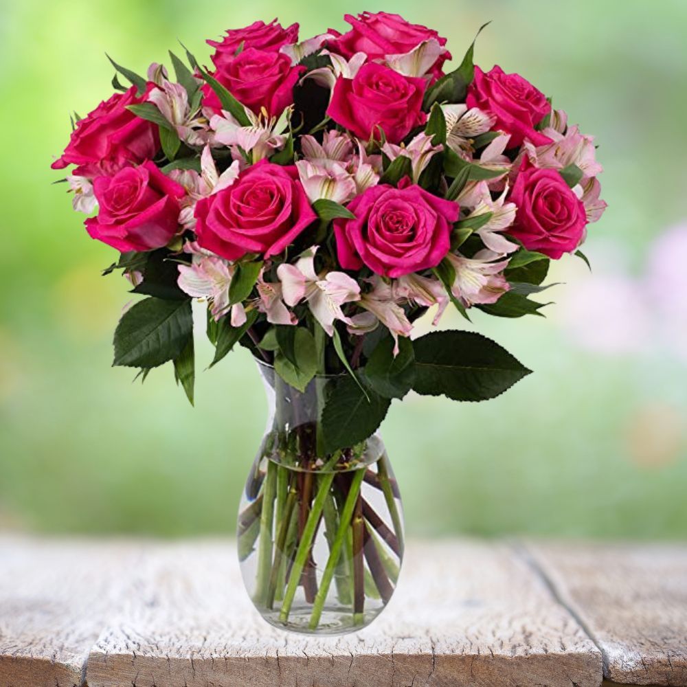 Introducing Benchmark Bouquets' Charming Roses and Alstroemeria, With Vase! This lovely arrangement features vibrant and fragrant roses and alstroemeria, adding a pop of color and joy to any space.