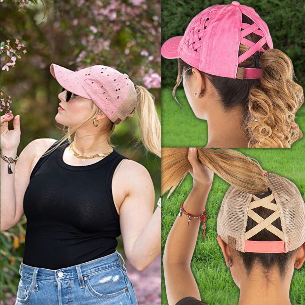- Vintage distressed washed design with crisscross elastic bands on the back for a ponytail hole.