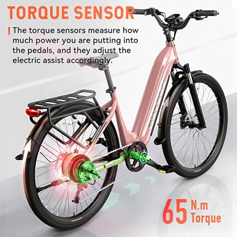 - HOVSCO Pink Electric Bikes are equipped with a powerful 500W high-speed BAFANG SUTTO brushless motor that provides a max speed of 28mph and 65Nm Torque Sensor that makes riding safer.