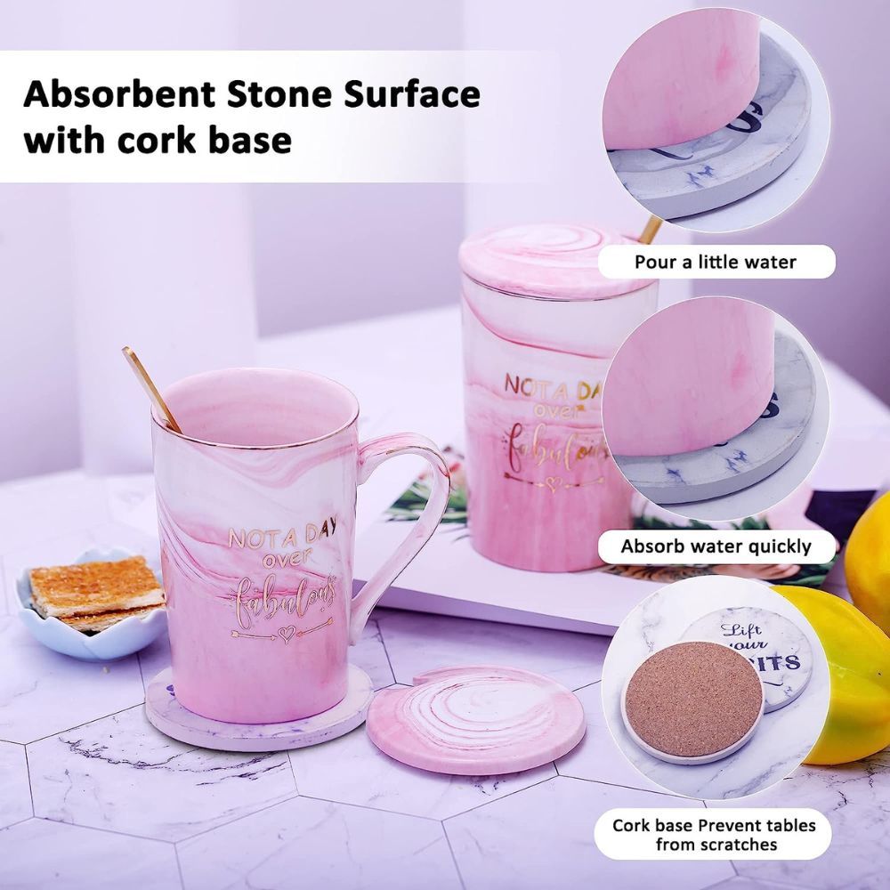 - Gift Box Packing: The mug comes with a cup lid, spoon, absorbent coaster, and pink greeting card. All items are shown in the packaging, making it ready for gift giving.