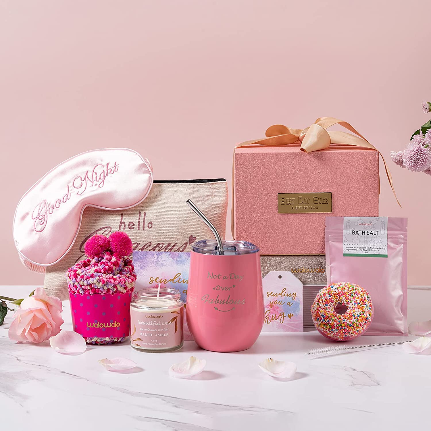 - Unforgettable Unboxing: Each gift box contains 12 gifts worth $108.98, including a rainbow pink insulated stainless-steel tumbler, scented candle, sleep mask, bath bomb, bath salt, cosmetic bag, cozy cupcake socks, luxury gift box, greeting card and gift tag.