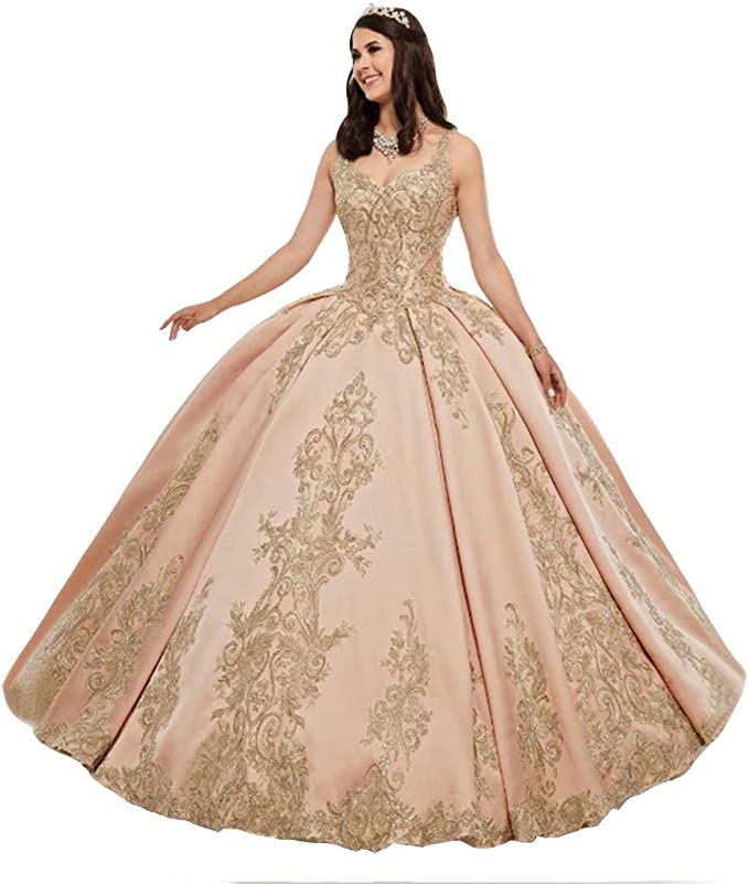 - The gold lace applique adds a touch of glamour to the gown, making it perfect for special occasions such as Quinceaneras, Sweet Sixteen parties, weddings, proms, and more.