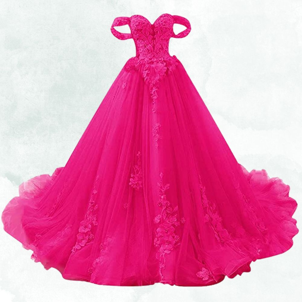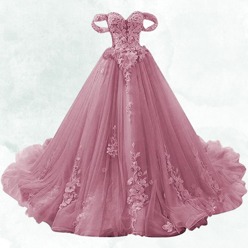 - The dress features an off-shoulder design with sleeveless lace appliques and a ball gown silhouette.