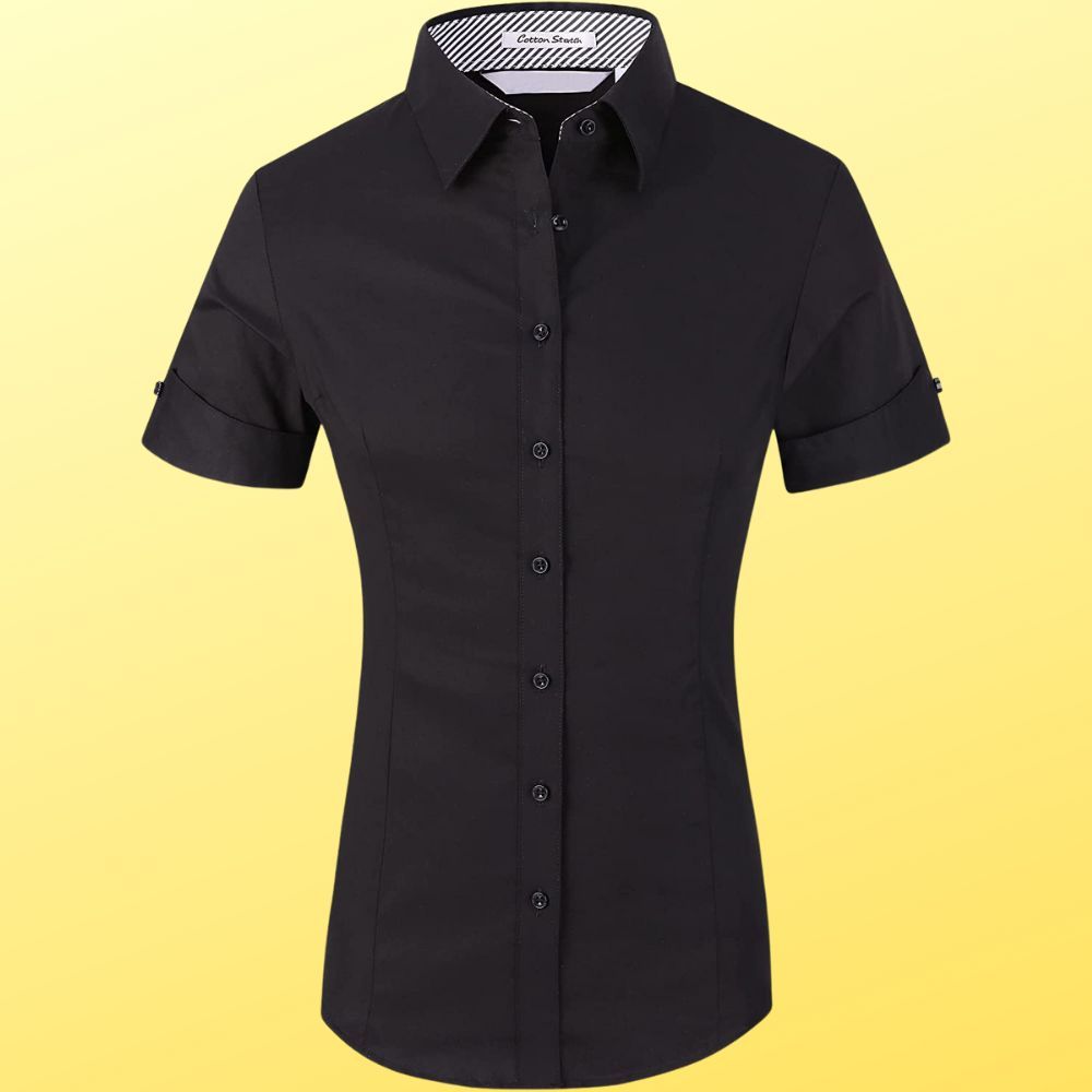 Alex Vando's new Short Sleeve Stretch Work Shirt is a must-have for any woman looking to make a statement. The classic silhouette features a spread collar and a turned over cuff with modern updates such as inner contrast detailing, adding sophistication and style.